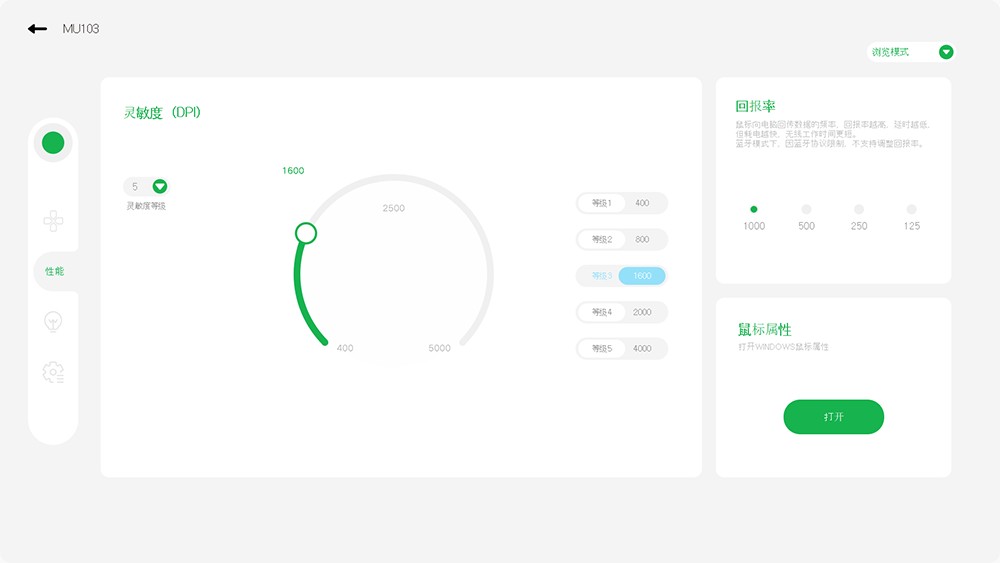 유그린 MU103 무선 게이밍 마우스는 400DPI(빨간색), 800DPI(녹색), 1,600DPI(블루), 2,000DPI(노란색), 4,000DPI(보라색)으로 설정할 수 있습니다. 그리고 아래쪽에서 살펴볼 전용 소프트웨어를 통해서 최대 5,000DPI까지 세팅할 수 있습니다.