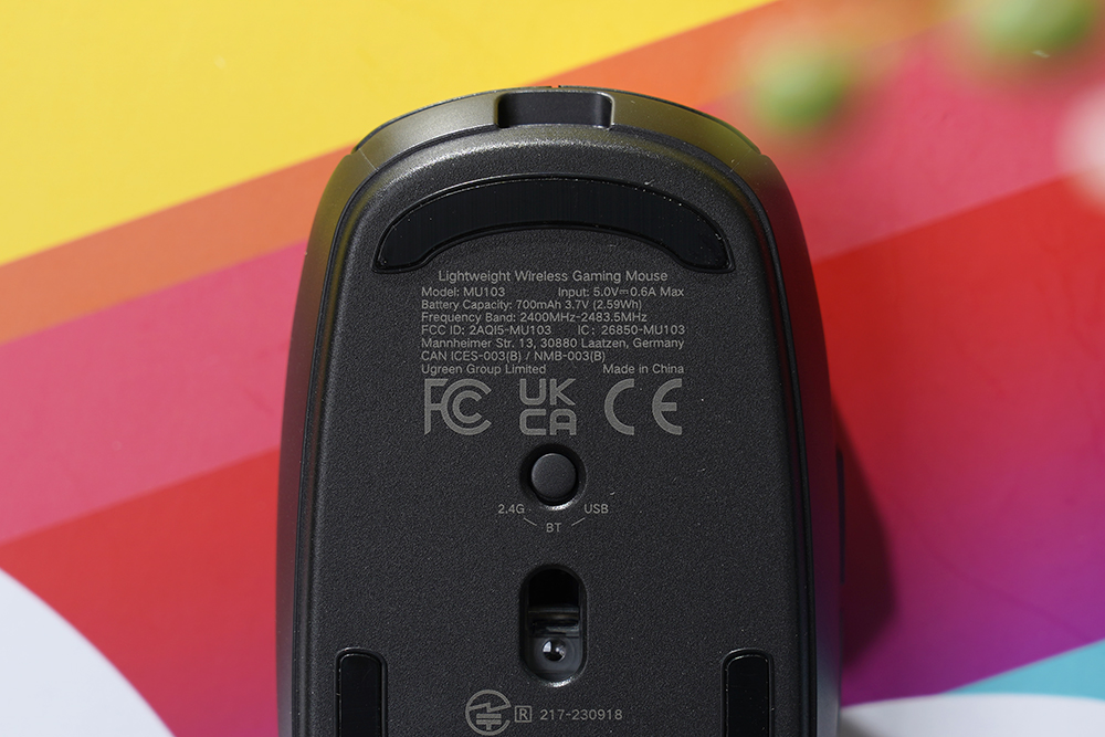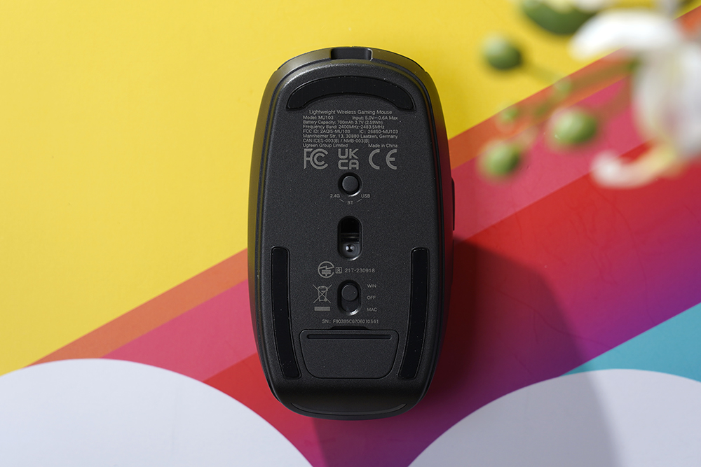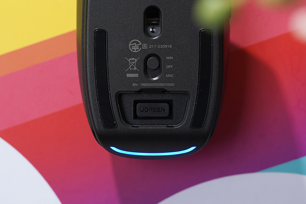 아래쪽을 살펴보면 전원과 마이크로소프트 윈도우 그리고 맥OS에서 사용할 수 있는 스위치가 배치되어 있습니다. 그리고 2.4GHz 무선 USB 수신기의 경우에는 유그린 MU103 무선 게이밍 마우스 본체에 수납되어 있어서 혹시 모를 분실을 방지할 수 있습니다. 그 외에도 아래쪽에는 디자인적인 완성도를 높여주는 LED 표시등이 배치되어 있습니다.
