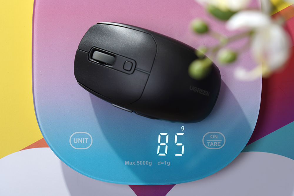 그리고 무게는 약 85g으로 측정되었습니다. 700mAh 용량의 배터리를 탑재하고 있다는 점을 고려하면 가벼운 편이라고 판단되었습니다. 실제로 무선 마우스들은 배터리와 각종 무선 부품 때문에 유선 마우스와 비교하면 무게가 약간 무거운 편입니다.