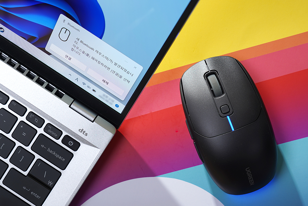 마지막으로 블루투스 기능의 경우에는 노트북이나 스마트폰 그리고 태블릿 등에 연결할 때 활용하면 좋을 것 같습니다. 연결 방법은 페어링 모드로 들어가면 최신 노트북들은 새 Bluetooth 마우스가 발견되었다는 메시지가 표시됩니다. 그리고 모바일 디바이스에서는 UGREEN BLE Mouse를 검색해서 연결해 주면 됩니다.