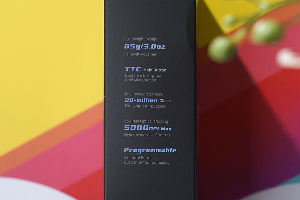 유그린 MU103 무선 게이밍 마우스의 특징들을 살펴보면 무게는 약 85g으로 무선 제품치고는 가벼운 편입니다. 그리고 TTC의 스위치가 메인 버튼으로 사용되었고 최대 2천만 번의 클릭 수명을 제공합니다. 그리고 전용 소프트웨어를 통해서 5개 버튼의 기능을 자신의 플레이하고 있는 게임에 맞게 커스터마이징할 수 있습니다.