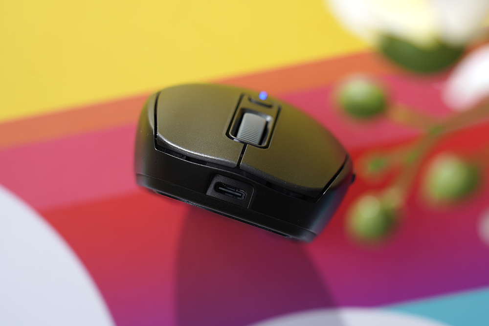 유그린 MU103 무선 게이밍 마우스의 앞쪽을 살펴보면 충전과 유선 연결을 위한 USB-C 포트가 배치되어 있습니다. C타입은 최근 스마트폰이나 태블릿 그리고 노트북 등에서 많이 활용되는 표준 규격이라서 호환성이 좋다는 장점이 있습니다.