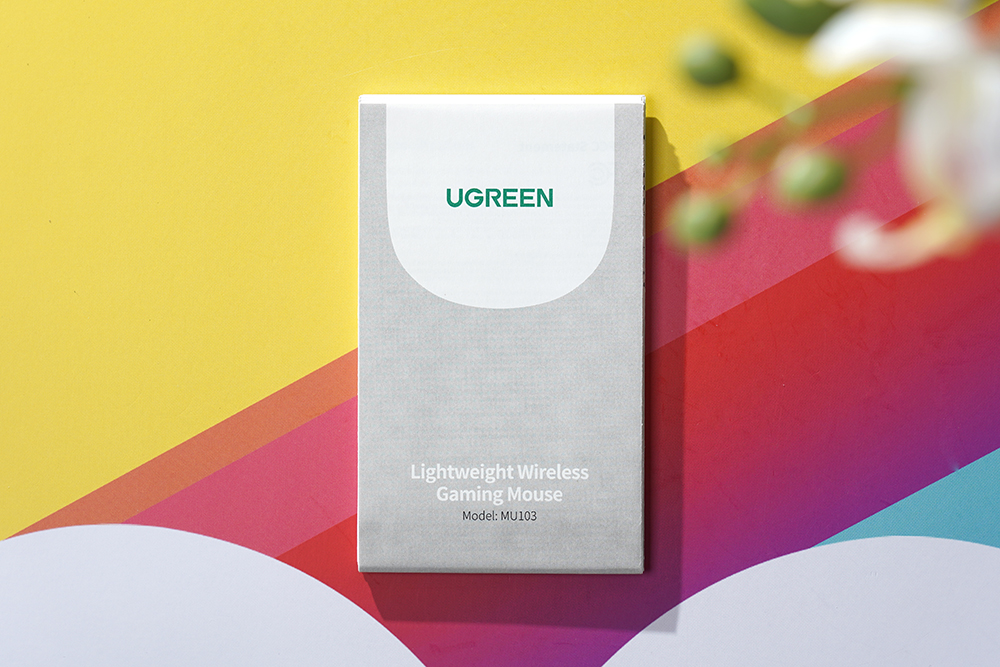 유그린 MU103 무선 게이밍 마우스의 박스는 세련된 스타일로 디자인되었습니다. 그리고 전면에는 가벼운 게이밍 마우스라는 문구와 함께 블루투스 기술을 지원한다는 문구가 인쇄되어 있습니다.