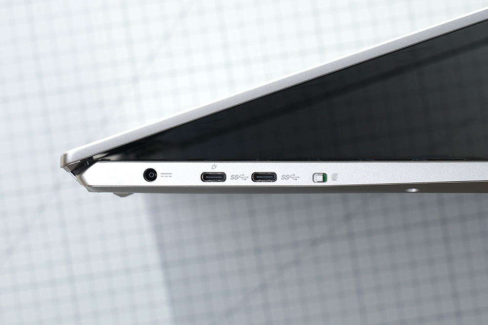 MSI 프레스티지 16 Studio A13VF Mini LED의 입출력 포트를 살펴보면 왼쪽에는 전원과 2개의 USB 3.2 타입C 그리고 슬라이딩 방식의 웹캠 잠금 스위치가 배치되어 있습니다.
