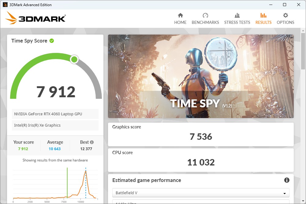 3D마크 벤치마크 소프트웨어를 통해서 엔비디아 지포스 RTX 4060 그래픽카드의 성능을 확인해 보면 파이어 스트라이크는 18,443점, 타임 스파이는 7,912점, 포트 로얄은 4,323점으로 측정되었습니다.