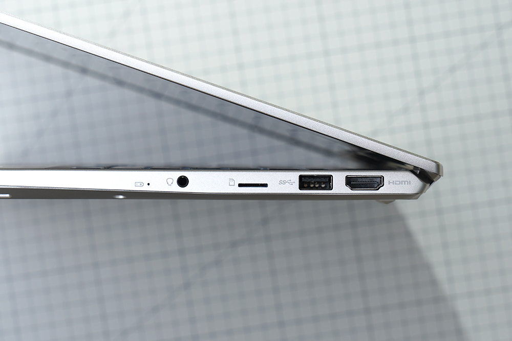 반대쪽 옆면에는 오디오 콤보 잭과 마이크로SD카드 리더 그리고 USB 3.2 타입A와 HDMI 단자가 배치되어 있습니다. 확장성은 준수한 수준이라고 판단되었습니다.