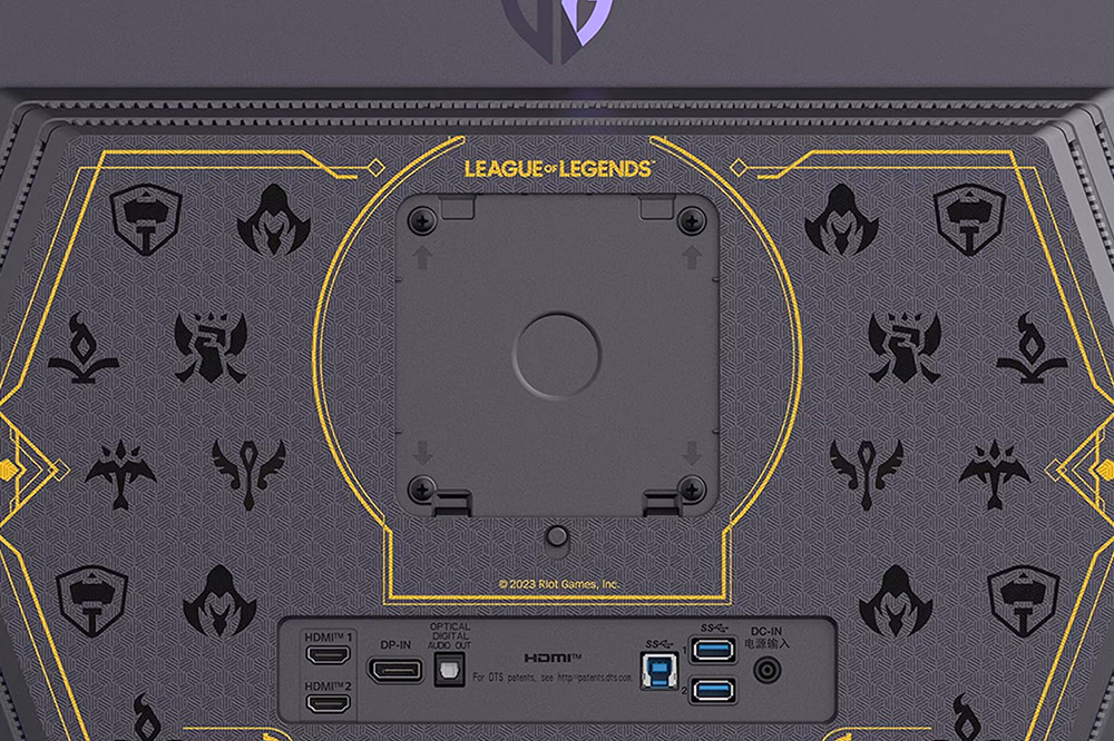 LG 올레드 게이밍모니터 LoL 에디션 27GR95QL의 뒷면도 리그 오브 레전드를 상징하는 로고들이 각인된 형태로 제작되었습니다. 전체적으로 디자인인 부분에서 차별점이 있는 편이라고 생각되었습니다. 그렇지만 이 정도 가격대의 제품이 별도의 후면 LED 조명을 탑재하지 않았다는 점은 아쉬운 부분입니다.
