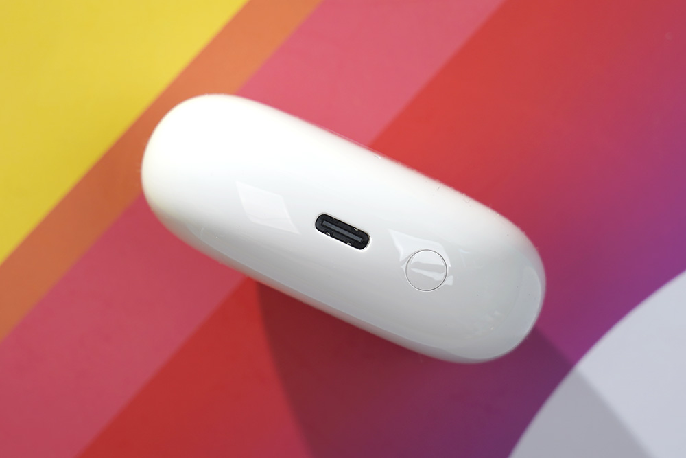 아래쪽에는 충전을 위한 USB-C 포트와 함께 페어링 버튼이 배치되어 있습니다. 참고로 버튼을 3초간 누르면 페어링 기능이 동작하고 약 10초간 누르면 팩토리 리셋이 진행됩니다. 그 외에도 유그린 T6 블루투스 이어폰와 같은 저전력 장치들을 오랫동안 사용하기 위해서는 가능하면 고성능의 어댑터에 연결하는 것보다는 저전력의 컴퓨터 등에 연결해서 충전하는 것을 추천합니다.