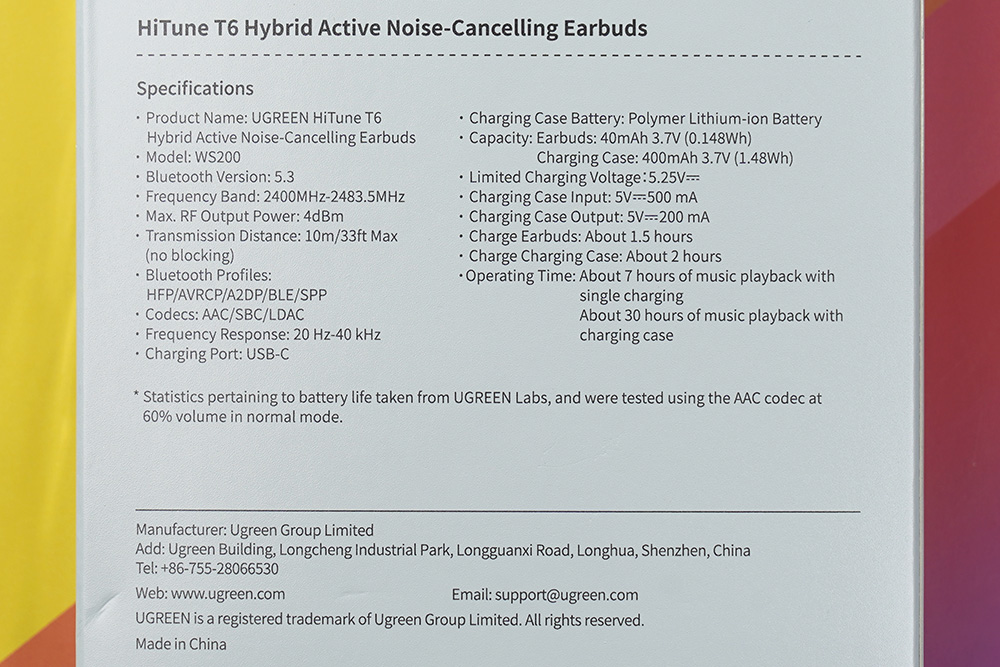 박스의 뒷면을 살펴보면 유그린 T6 블루투스 이어폰의 스펙이 표시되어 있습니다. 주요 내용들을 살펴보면 모델 이름은 W200이고 블루투스 V5.3을 지원하는 BES2600Z 칩셋이 사용되었습니다. 그리고 고음질 블루투스 코덱인 LDAC을 지원해서 상대적으로 고음질 사운드를 감상할 수 있습니다. 그 외에도 IPX 5등급의 생활 방수도 제공합니다.
