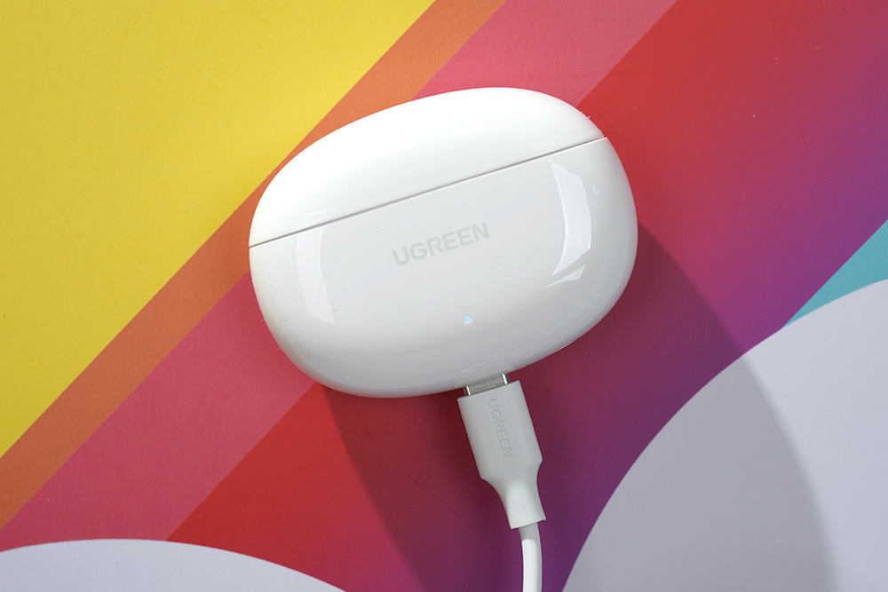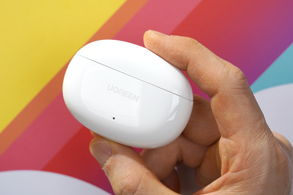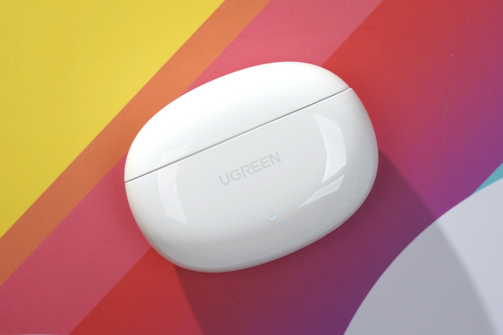유그린 T6 블루투스 이어폰의 충전 케이스는 깔끔한 유광의 화이트 색상으로 제작되었고 전체적으로 둥글둥글하게 디자인되었습니다. 그리고 전면에는 LED가 내장되어 있어서 충전 상태를 바로 확인할 수 있다는 특징이 있습니다.