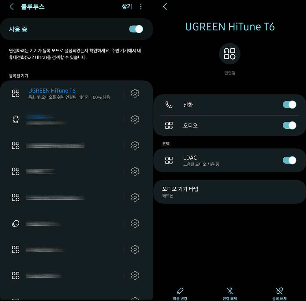 그리고 처음 유그린 T6 블루투스 이어폰의 덮개를 개봉하면 바로 페어링 모드로 들어가고 UGREEN HiTune T6라는 이름을 검색해서 등록할 수 있습니다. 그리고 배터리 상태와 고음질 오디오 코덱인 LDAC 관련 메뉴가 표시되는 것을 확인할 수 있습니다.