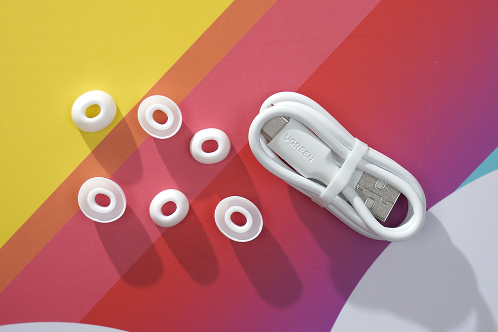 유그린 T6 블루투스 이어폰에는 총 4쌍의 이어팁(이어캡)이 포함되어 있습니다. 미묘하게 크기가 조금씩 달라서 자기 귀에 맞는 제품을 장착할 수 있습니다. 그리고 충전을 위한 짧은 길이의 USB-C 케이블도 기본으로 제공됩니다.