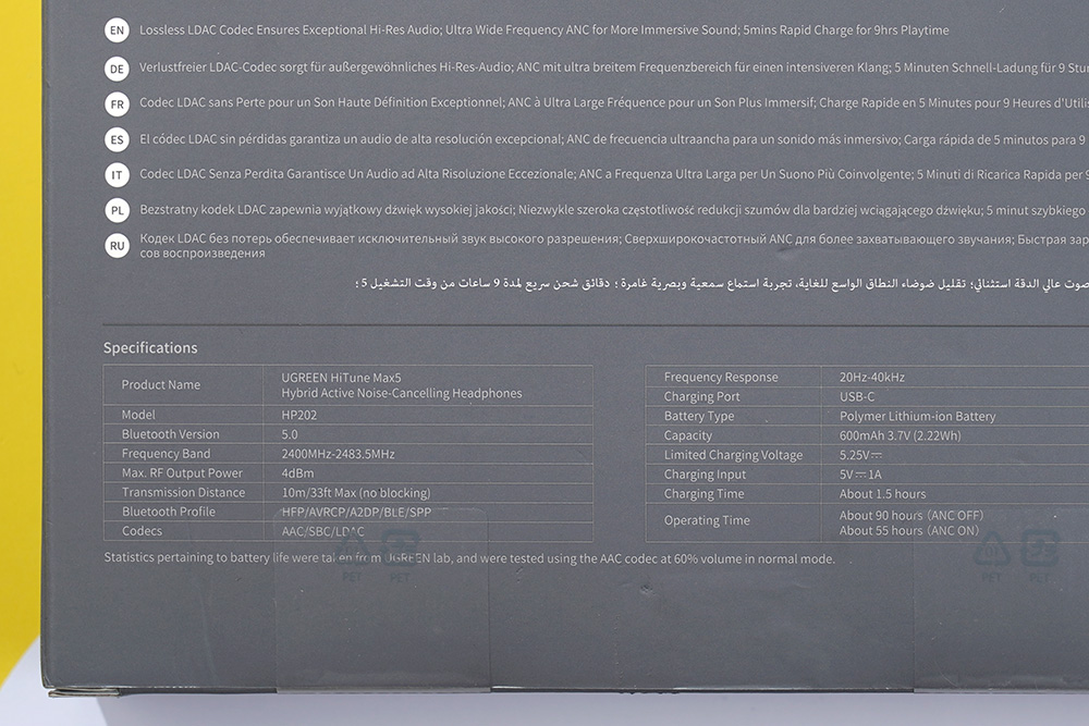 박스의 뒷면을 살펴보면 유그린 맥스5 블루투스 헤드폰의 스펙이 표시되어 있습니다. 내용을 살펴보면 블루투스 버전은 5.0이고 모델명은 HP202입니다. 그리고 AAC/SBC/LDAC 코덱을 지원합니다.