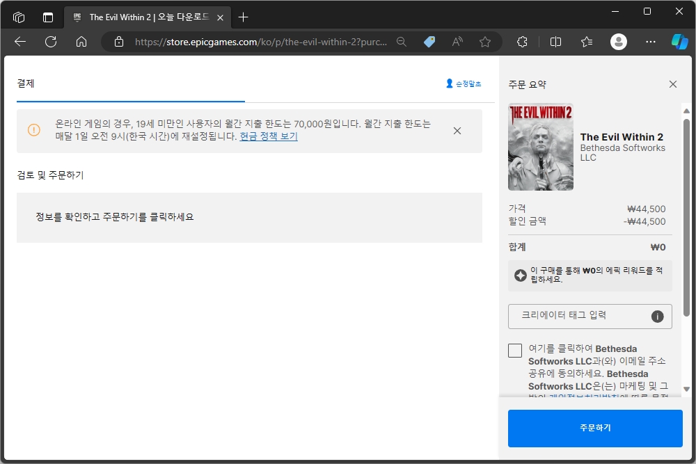 결제 페이지를 확인해 보면 할인 금액이 적용되어서 합계가 0원인 것을 확인할 수 있습니다. 그리고 아래쪽에 이메일 주소 공유에 체크를 하면 베데스다 소프트웍스에서 게임 관련 메일이 올 수 있습니다.
