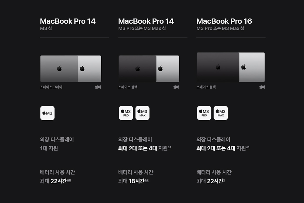 맥북프로는 크게 M3와 M3 프로 그리고 M3 칩을 탑재한 제품으로 구성되어 있습니다. 각각의 제품들은 애플의 정책 때문에 엄격하게 라인업이 구분되어 있습니다. 특히 재미있는 부분은 새로운 색상인 스페이스 블랙은 M3 프로와 M3 맥스를 탑재한 14인치, 16인치 모델에서만 선택할 수 있다는 점입니다. 그 외에도 외장 디스플레이의 숫자에서도 차이가 발생합니다.