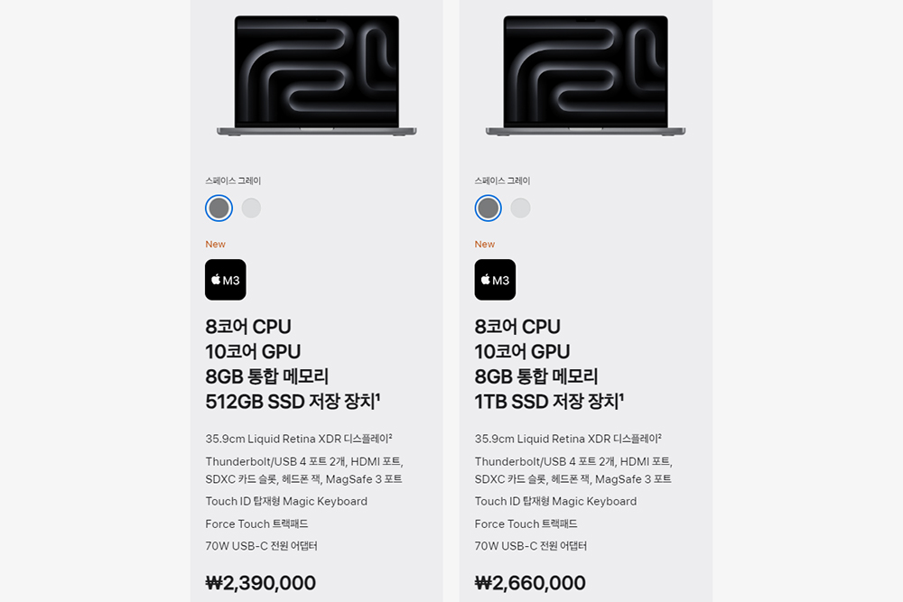 가장 먼저 애플 실리콘 M3칩을 탑재한 맥북프로 14인치 모델의 경우에는 8코어 CPU와 10코어 GPU 그리고 8GB 통합 메모리, 512GB/1TB SSD 저장 장치를 가지고 있습니다. 가격은 각각 239만원과 266만원으로 책정되었는데요. 역시 램크루지인 애플답게 239만원짜리 모델에서도 메모리가 8GB입니다.