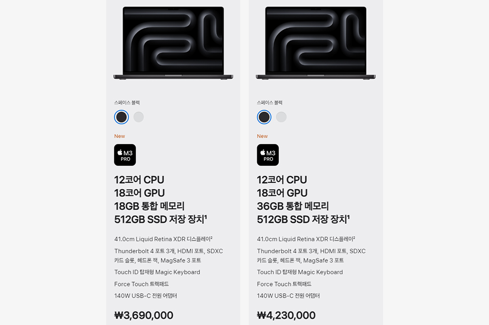 맥북프로 16인치 모델은 M3 프로 칩만 탑재되어 있습니다. 12코어 CPU와 18코어 GPU 그리고 18GB/36GB 통합 메모리와 512GB SSD 저장 장치를 탑재한 모델이 각각 369만원과 423만원으로 책정되었습니다. 참고로 14인치 모델은 96W USB-C 전원 어댑터가 제공되고 16인치 모델은 140W USB-C 전원 어댑터가 제공됩니다.