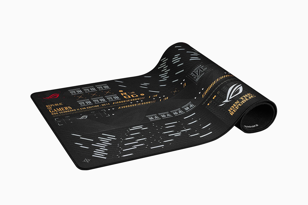 ROG Scabbard II EVA Edition 데스크 매트는 키보드와 마우스를 올려놓고 사용할 수 있습니다. NERV와 EVA에서 영감을 얻은 디자인이 채택되었고 물이나 기름, 먼지를 차단하는 나노 코팅 표면 처리가 되어 있다고 합니다.