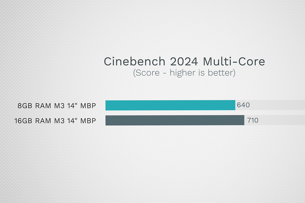 가장 먼저 시네벤치 2024의 멀티코어 성능의 경우에는 맥북프로 M3 8GB 모델의 점수는 640점 맥북프로 M3 16GB 모델의 점수는 710점으로 측정되었습니다. 벤치마크 프로그램 상의 점수는 크게 차이가 나지 않는 것을 확인할 수 있습니다.