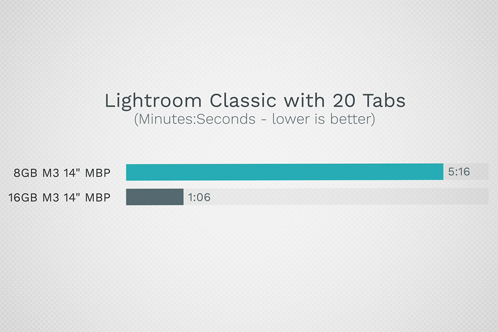 특히 20개의 탭을 실행한 상태에서 라이트룸 클래식을 실행하면 작업 시간이 5배 정도까지 늘어나는 것을 확인할 수 있습니다. 메모리의 용량 부족으로 인해서 SSD의 스왑 파일이 늘어나기 때문으로 보입니다.