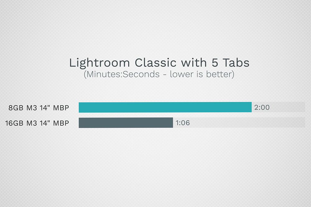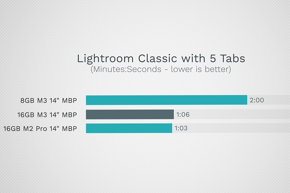그런데 실제 우리가 작업을 하는 환경대로 5개의 탭을 실행한 상태에서 라이트룸 클래식을 실행시키면 작업 시간이 약 2배 정도 늘어나는 것을 확인할 수 있습니다. 그래서 맥북프로 M2 16GB 모델보다도 오히려 느려지는 것을 확인할 수 있습니다.