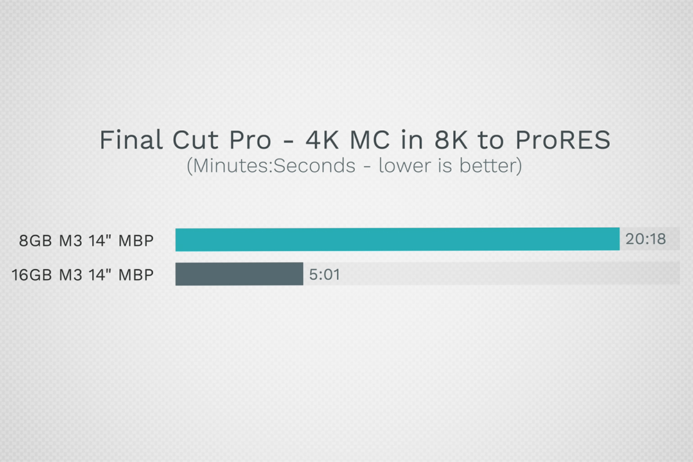 파이널 컷 프로에서 작업을 할 때도 약 4배 정도의 작업 시간 차이가 발생하고 있습니다. 그리고 맥북프로 M3 8GB에서는 블렌더 렌더링과 파이널 컷 익스포트 작업을 할 때 오류로 실행이 되지 않는 경우도 종종 있었고 레이트레이싱 가속 작업은 아예 비활성화되어 있다고 합니다.