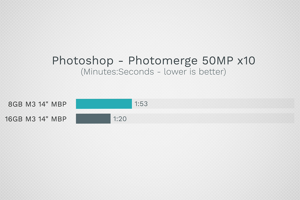 마지막으로 포토샵의 경우에는 맥북프로 M3 8GB와 16GB 모델의 작업 시간 차이가 그렇게 크지는 않은 것으로 보입니다. 아무래도 작업량이 많아질수록 차이가 점차 심해질 것으로 보입니다.
