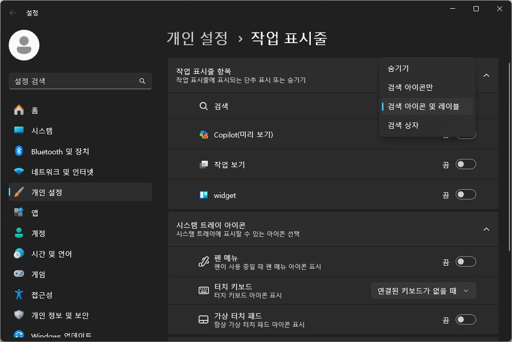 우선 윈도우 11의 작업 표시줄에서 마우스 오른쪽 버튼을 눌러서 작업 표시줄 설정을 확인해 보면 검색과 코파일럿(Copilot), 작업 보기, 위젯(widget)을 켜고 끌 수 있는 기능이 준비된 것을 확인할 수 있습니다. 필요에 따라서 선택적으로 활용해주면 되고 검색기능은 아이콘만 표시하거나 레이블을 추가할 수 있는 기능도 제공됩니다.