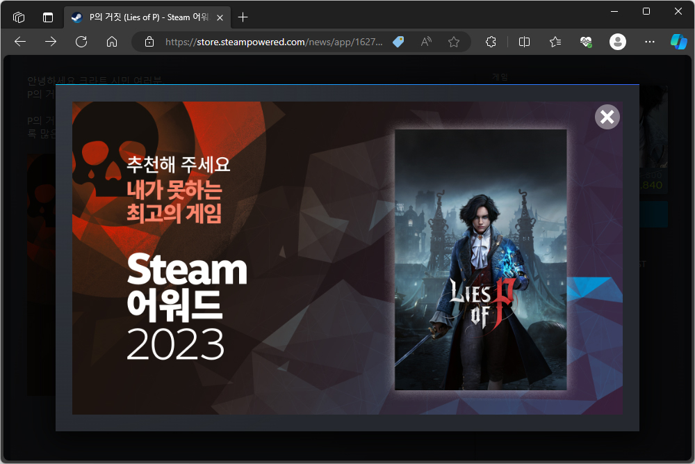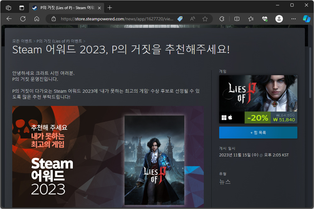 국내의 게임사인 네오위즈의 라운드8 스튜디오에서 제작된 P의 거짓은 MMORPG게임이 주를 이루던 국내 시장에서 소울라이크 형태의 액션게임들도 만들 수 있다는 것을 알려주는 계기가 된 작품입니다. 특히 2023년 대한민국 게임대상 대상을 받아서 화제성까지 갖춘 게임이 되었습니다. 그럼 이번 포스팅에서는 P의 거짓을 20% 할인 받고 구매하는 방법을 자세하게 확인해 보도록 하겠습니다.