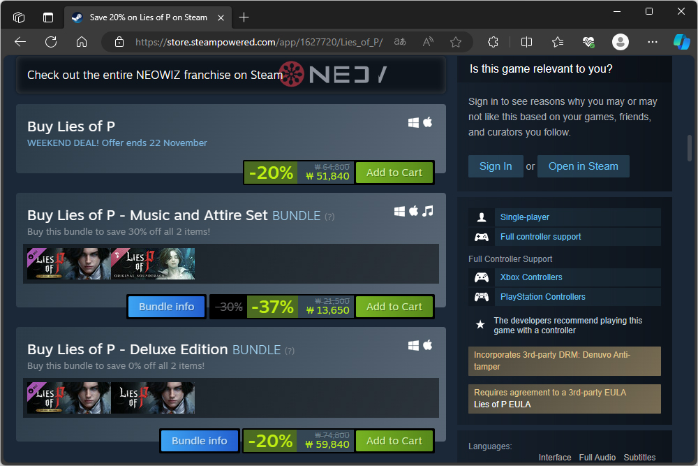 P의 거짓은 현재 20% 할인하고 있어서 일반판은 51,840원(정가 64,800원)에 판매하고 있고 음악과 의상 세트는 13,650원(정가 21,500원) 그리고 디럭스 에디션은 59,840원(74,800원)으로 세일을 하고 있습니다. 그래서 소울라이크류의 게임을 좋아하는 분들은 이번 기회에 소장해 보시는 것이 좋을 것 같습니다.