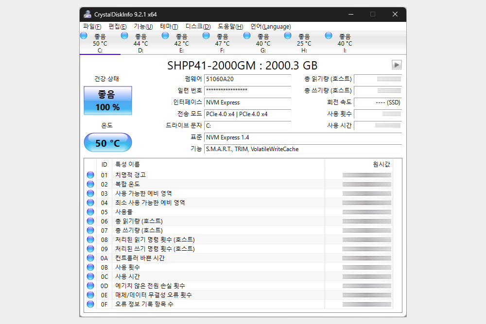 크리스탈 디스크 인포(CrystalDiskInfo)를 실행시키면 현재 자신의 컴퓨터에 설치된 SSD/HDD의 리스트와 온도를 확인할 수 있습니다. 요즘과 같은 겨울에는 크게 상관없지만 더운 여름에는 온도도 어느 정도 신경을 써주어야 합니다. 특히 PCIe 4.0 혹은 5.0 제품들은 온도에 따른 속도 저하 문제가 발생할 수 있습니다.