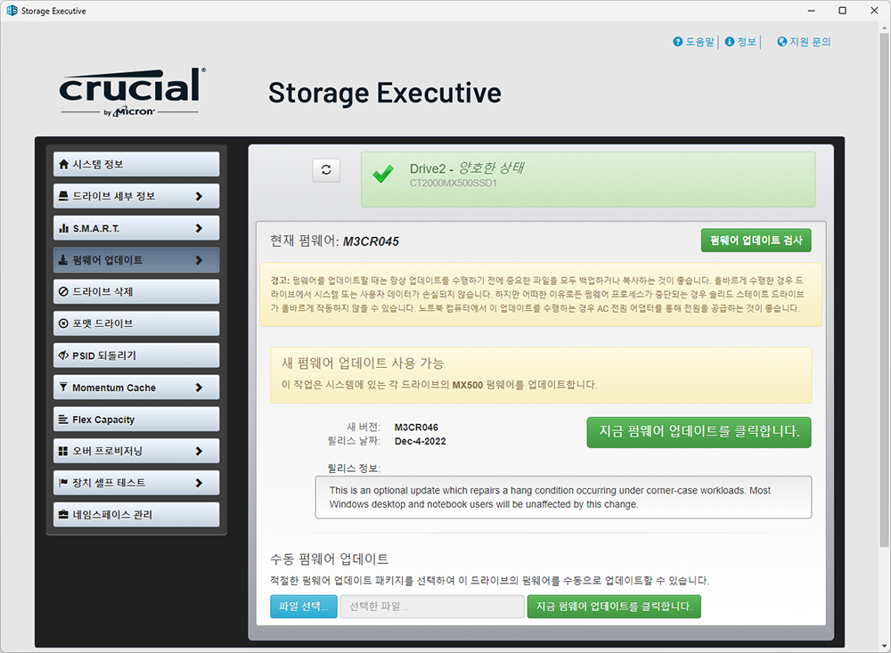 Crucial MX500 SSD의 펌웨어 업데이트를 하기 위해서는 Crucial 스토리지 이그제큐티브라는 전용 소프트웨어가 필요합니다. 그리고 설치하면 현재 컴퓨터에 장착된 스토리지들의 정보를 자동으로 읽은 다음 펌웨어 업데이트가 필요한 제품은 새 펌웨어 사용 가능이라는 문구가 표시됩니다. 자세한 내용을 확인해 보면 MX500 2TB 제품의 펌웨어 버전이 M3CR045에서 M3CR046으로 변경된 것을 확인할 수 있습니다.