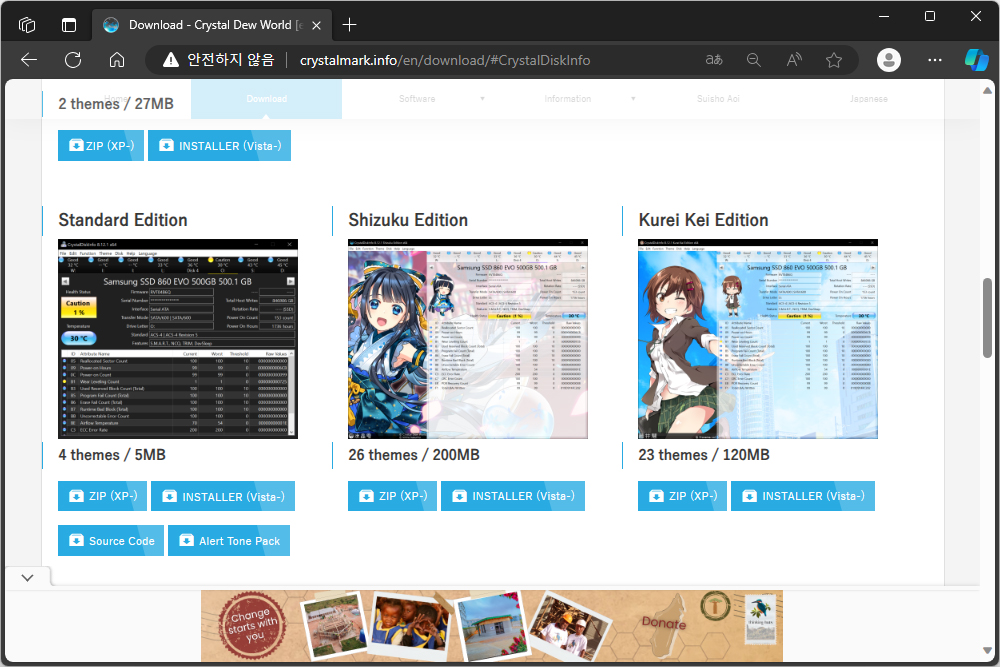 우선 크리스탈 디스크 인포(CrystalDiskInfo)를 다운로드 받아야 합니다. 버전은 Aoi와 Standard 그리고 Shizuku와 Kurei Kei 4가지가 준비되어 있습니다. 자신의 취향에 따라서 선택해서 다운로드를 받는 것을 추천합니다. 저는 얌전한 스탠다드가 좋을 것 같습니다. 그리고 SSD의 속도를 체크할 수 있는 크리스탈 디스크 마크(CrystalDiskMark)도 다운로드 받을 수 있습니다.
