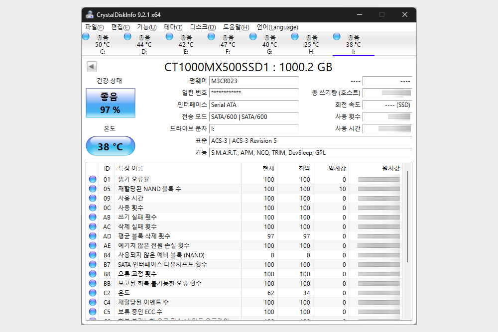 제가 사용하고 있는 Crucial MX500 SSD의 정보를 확인해 보면 SATA3 방식을 지원하는 제품이고 펌웨어 버전은 M3CR023인 것을 확인할 수 있습니다. 그리고 총 쓰기량과 사용 시간 등도 확인할 수 있습니다. 특히 SSD를 중고 거래하거나 새로 구매했을 때 사용 시간을 통해서 어느 정도의 정보를 확인할 수 있습니다.