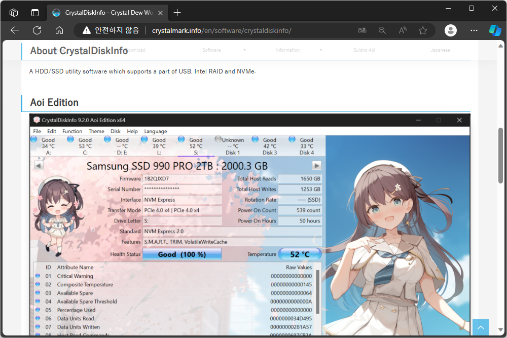 우선 크리스탈 디스크 인포(CrystalDiskInfo)를 다운로드 받아야 합니다. 버전은 Aoi와 Standard 그리고 Shizuku와 Kurei Kei 4가지가 준비되어 있습니다. 자신의 취향에 따라서 선택해서 다운로드를 받는 것을 추천합니다. 저는 얌전한 스탠다드가 좋을 것 같습니다. 그리고 SSD의 속도를 체크할 수 있는 크리스탈 디스크 마크(CrystalDiskMark)도 다운로드 받을 수 있습니다.