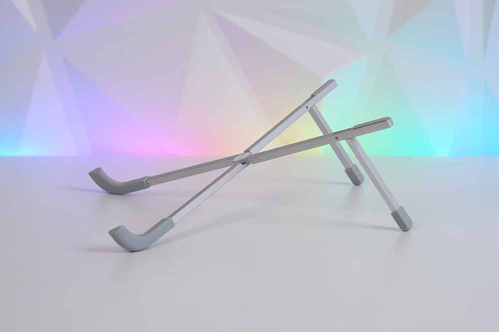 유그린 휴대용 노트북 스탠드 거치대는 접이식 다리를 가지고 있어서 완전히 펼치면 뒤쪽이 약 80mm 정도 올라가게 됩니다. 그리고 흡사 가위와 같은 접이식 구조를 갖추고 있어서 편리하게 사용할 수 있습니다.