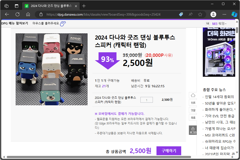 2024 다나와 굿즈 댄싱 블루투스 스피커는 다나와 포인트 마켓에서 구매를 할 수 있습니다. 캐릭터 랜덤 상품의 경우에는 20,000P(포인트)와 함께 2,500원에 구매할 수 있고 캐릭터를 지정했을 때는 24,000P(포인트)와 함께 2,500원에 구매할 수 있습니다. 그리고 아쉽게도 에이수스 캐릭터를 현재 품절 상태입니다.