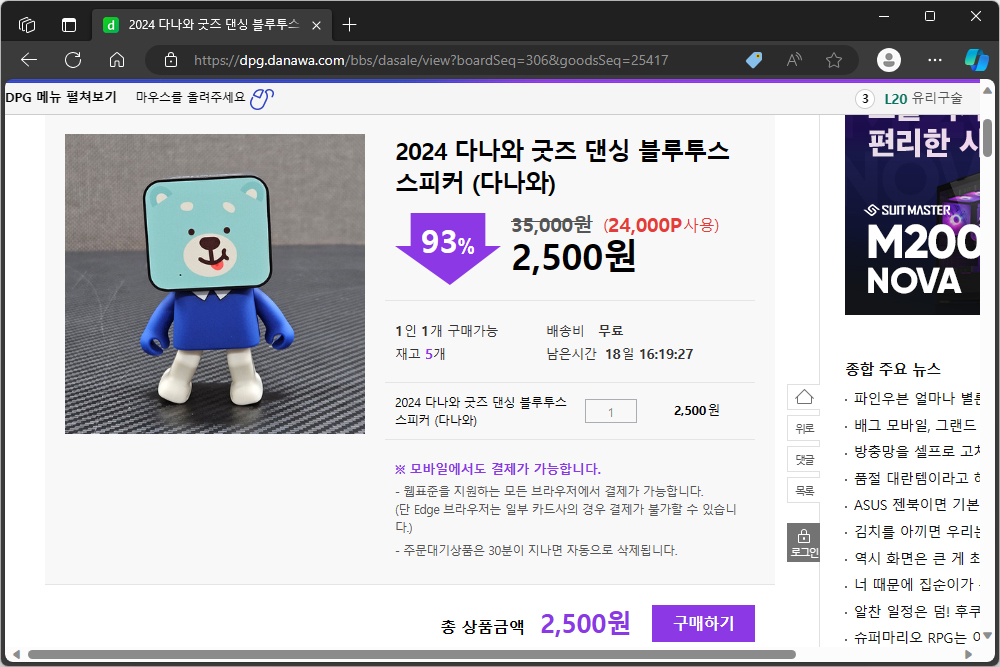 2024 다나와 굿즈 댄싱 블루투스 스피커는 다나와 포인트 마켓에서 구매를 할 수 있습니다. 캐릭터 랜덤 상품의 경우에는 20,000P(포인트)와 함께 2,500원에 구매할 수 있고 캐릭터를 지정했을 때는 24,000P(포인트)와 함께 2,500원에 구매할 수 있습니다. 그리고 아쉽게도 에이수스 캐릭터를 현재 품절 상태입니다.