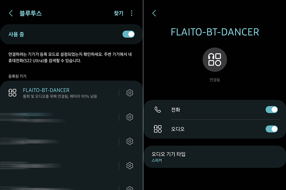 2024 다나와 굿즈 댄싱 블루투스 스피커의 전원 버튼을 3초간 길게 누르면 페어링 모드로 들어가고 FLAITO-BT-DANCER라는 이름을 스마트폰이나 태블릿에서 검색해서 연결해주면 됩니다. 그리고 현재 배터리 상태도 표시된다는 점이 편리한 부분입니다.