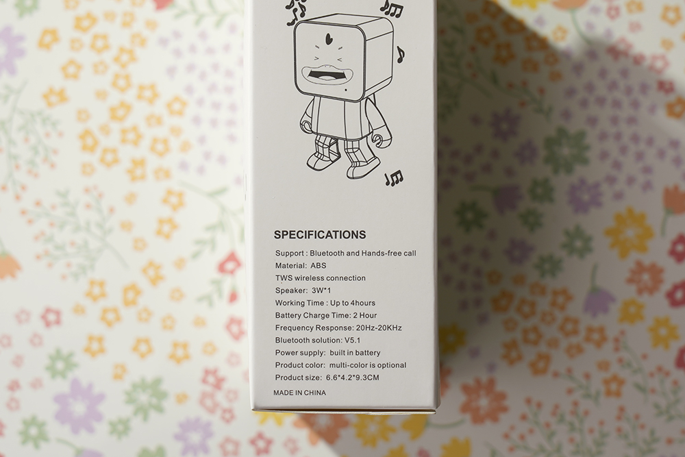 박스의 옆쪽에는 스펙이 표시되어 있습니다. 소재는 ABS 재질로 제작되었고 3W 출력의 스피커가 하나 탑재되어 있습니다. 그리고 블루투스 버전 V5.1을 지원한다는 특징이 있습니다.