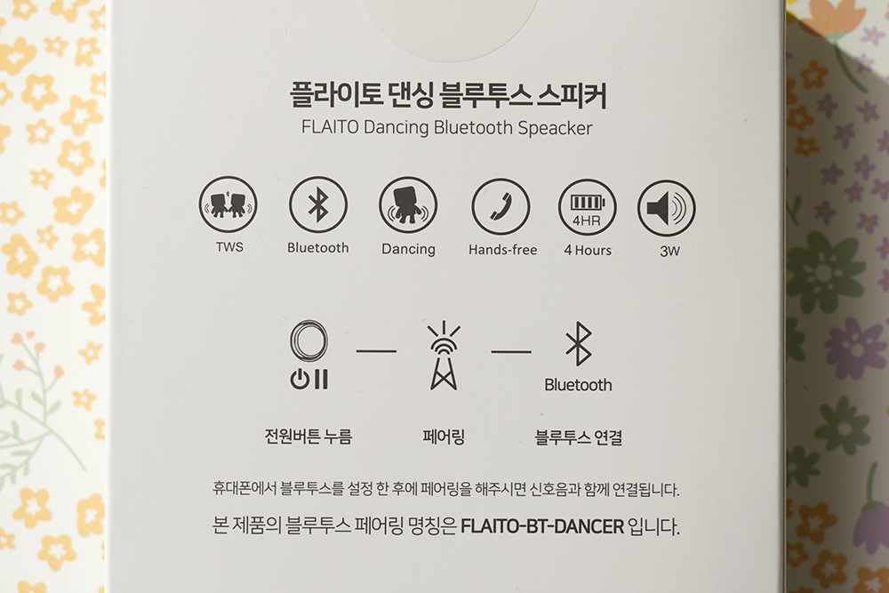 박스의 뒤쪽에는 특징이 표시되어 있습니다. 우선 2대를 동시에 연결해서 풍성한 사운드를 감상할 수 있고 춤을 추는 기능이 탑재되었다는 점이 차별화된 특징이라고 할 수 있습니다. 그리고 재생 시간은 4시간을 길지는 않은 편입니다.