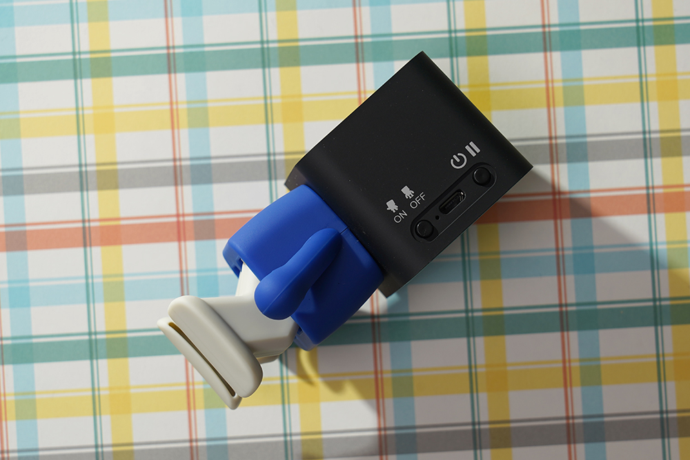 옆쪽을 살펴보면 전원 버튼과 충전을 위한 마이크로 5핀 단자 그리고 춤추는 속도 조절 멈춤/느림/빠름/OFF 버튼이 배치되어 있습니다. 구정 자체는 심플한 편이어서 어렵지 않게 활용할 수 있습니다.