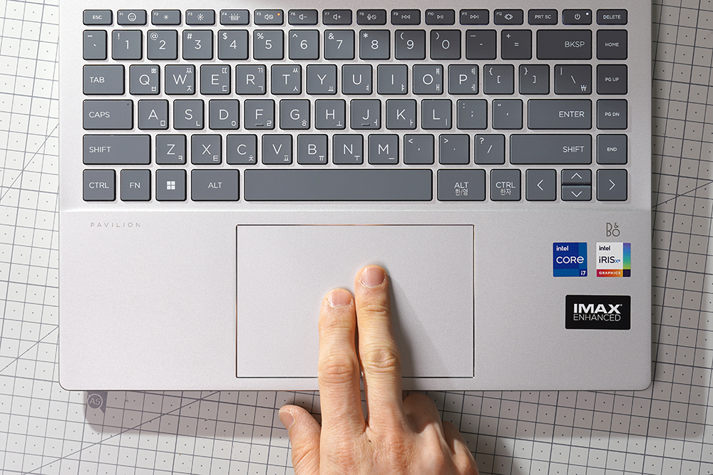 HP 파빌리온 플러스 14-ew0019TU의 키보드 키감은 깔끔한 느낌을 주는 편입니다. 그래서 크게 불편함 없이 문서 작업을 할 수 있습니다. 그리고 터치패드는 멀티터치를 지원해서 웹 페이지나 문서를 스크롤 하는 등의 용도로도 활용할 수 있습니다.