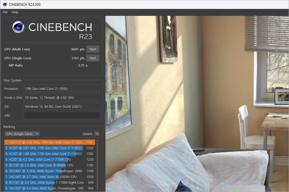 씨네벤치(CINEBENCH) R23.200을 통해서 13세대 인텔® 코어™ i7-1355U의 성능을 확인해 보면 멀티코어는 6,601점(pts), 싱글 코어는 1,761점(pts)으로 측정되었습니다.