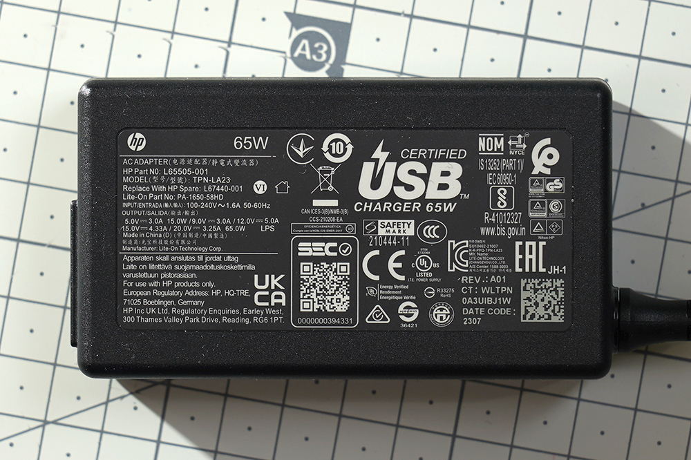 HP 파빌리온 플러스 14-ew0019TU의 어댑터를 살펴보면 입력은 프리볼트를 지원해서 해외에서도 사용할 수 있고 출력은 최대 65W입니다. 그리고 USB-C 포트를 탑재하고 있어서 호환성이 높은 편이라는 장점이 있습니다.