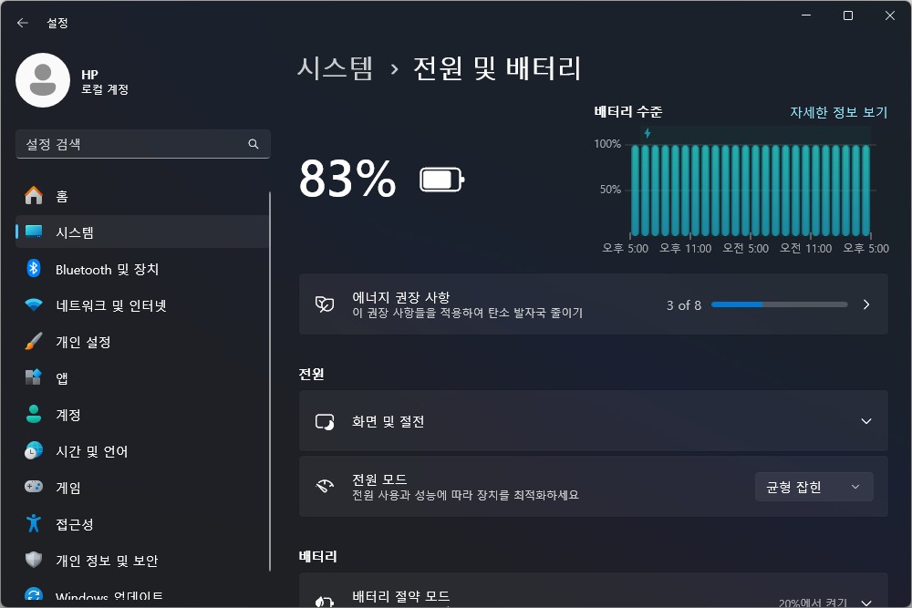 HP 파빌리온 플러스 14-ew0019TU에는 68Wh 용량의 배터리가 탑재되었고 화면 밝기 100%에서 유튜브 동영상을 1시간 정도 시청했을 때 약 83% 정도의 배터리가 남아 있었습니다. 그 외에도 USB-C 포트를 이용한 고속 PD 충전을 지원한다는 특징이 있습니다.