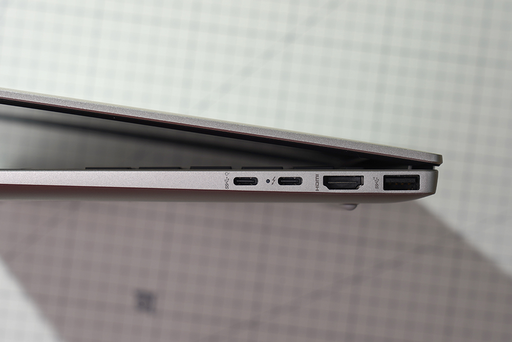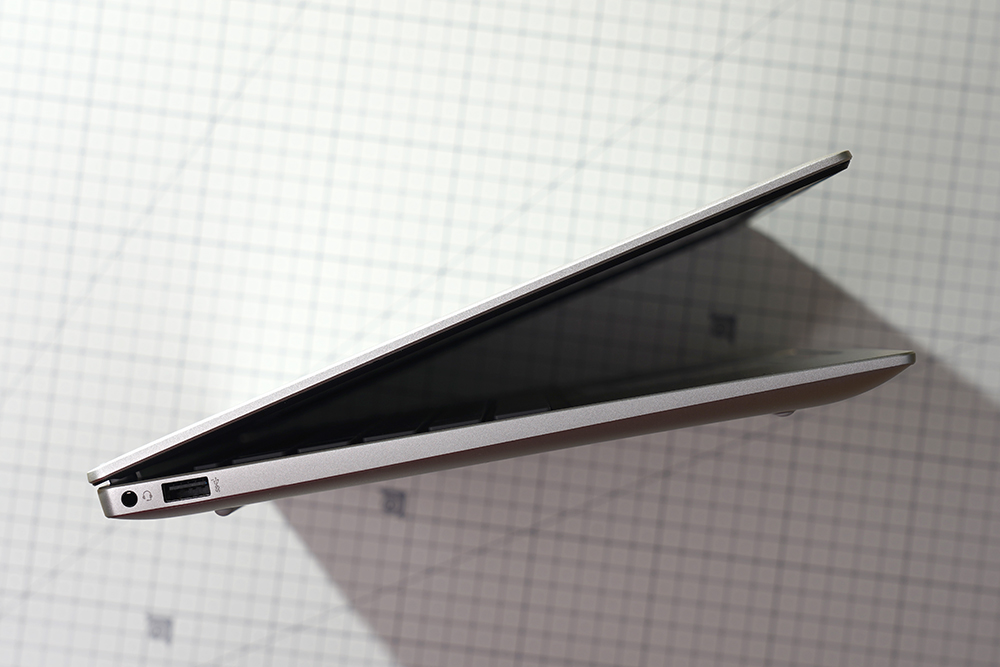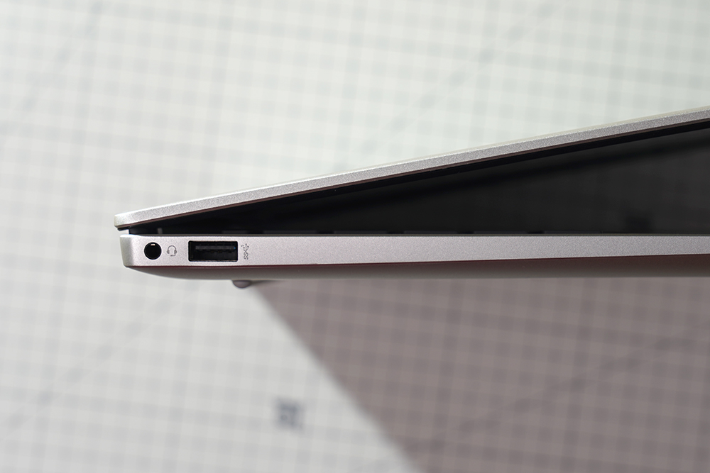 HP 파빌리온 플러스 14-ew0019TU의 입출력 포트를 살펴보면 왼쪽에는 헤드폰 / 마이크 콤보잭과 USB Type-A 5Gbps 포트가 배치되어 있습니다. 그리고 메탈로 제작되어서 모서리 부분의 마감도 좋은 편이라고 판단되었습니다.
