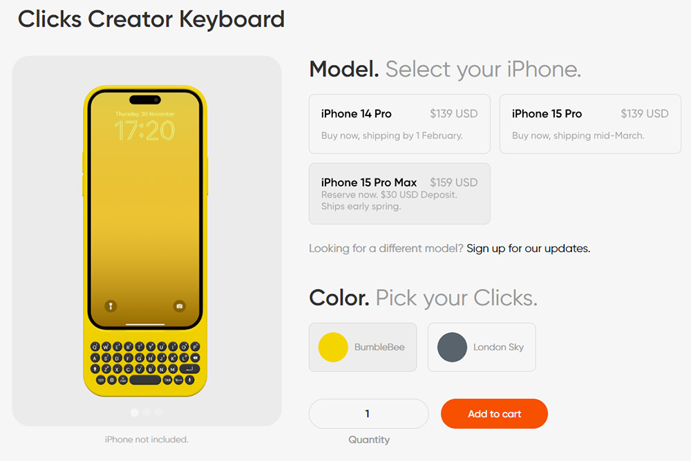 클릭스 크리에이터 키보드(Clicks Creator Keyboard)는 아이폰에 장착해서 사용하는 형태로 제작되었습니다. 잠고로 아이폰 14 프로와 아이폰 15 프로 그리고 아이폰 15 프로 맥스 용이 준비되어 있습니다. 참고로 색상은 범블비(BumbleBee)와 런던 스카이(London Sky) 중에서 선택할 수 있습니다.