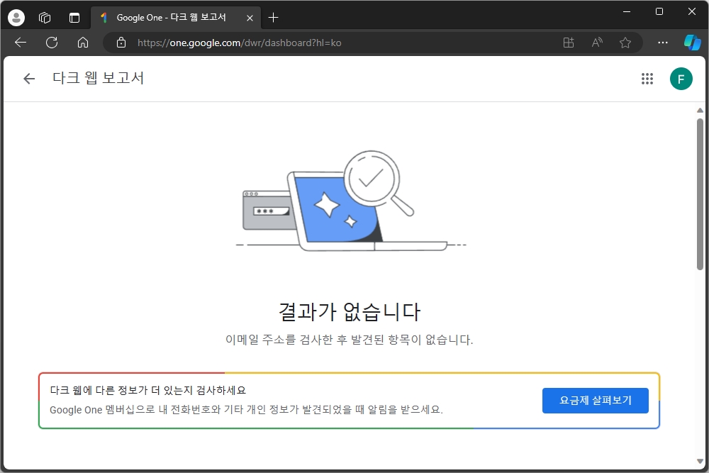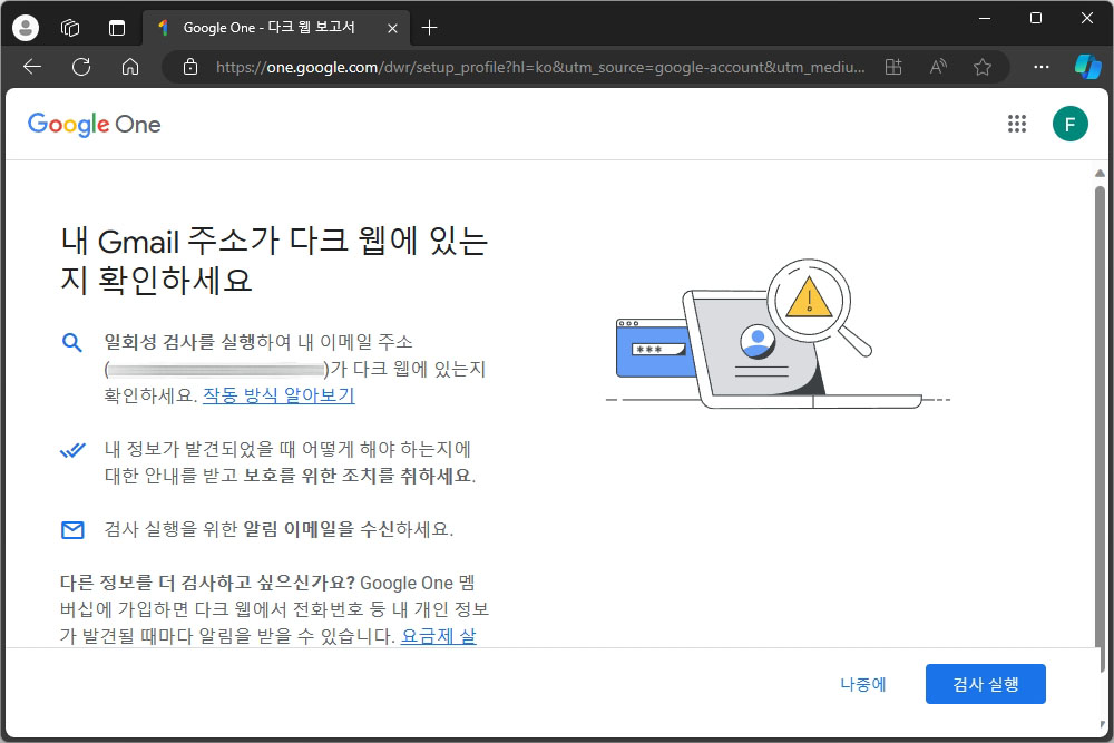 아래쪽에 배치된 검사 실행을 선택하면 몇 초가 지나면 검색 결과가 표시됩니다. 만약 자신의 이메일 주소가 유출되었다면 그에 맞는 절차를 밟아서 더 이상 개인정보가 유출되는 것을 방지해주는 것이 좋을 것 같습니다. 그리고 사실 이러한 기능은 Google One 멤버십 가입을 위한 기능으로 해당 서비스에 가입하면 개인정보가 유출되었을 때 알림을 받을 수 있다고 합니다.