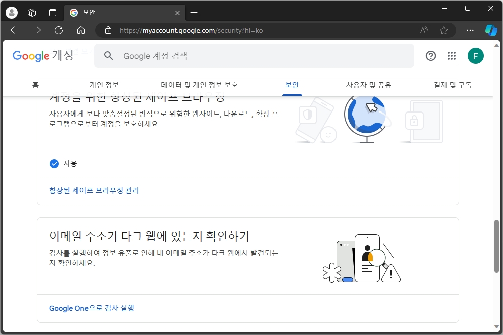 그리고 보안 메뉴를 확인해 보면 아래쪽에 “내 Gmail 주소가 다크 웹에 있는지 확인하기”라는 옵션이 준비되어 있고 Google One으로 검사 실행을 눌러서 다음 메뉴로 이동할 수 있습니다.